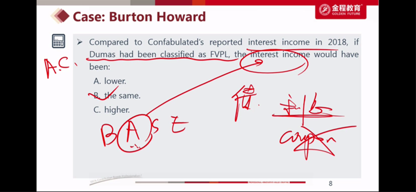 FVPL下的interest income应该是fv*r吧?和摊销法下的账面价值*r不一样。所以转成fvpl后利息收入应该更大才对(fv更高)?