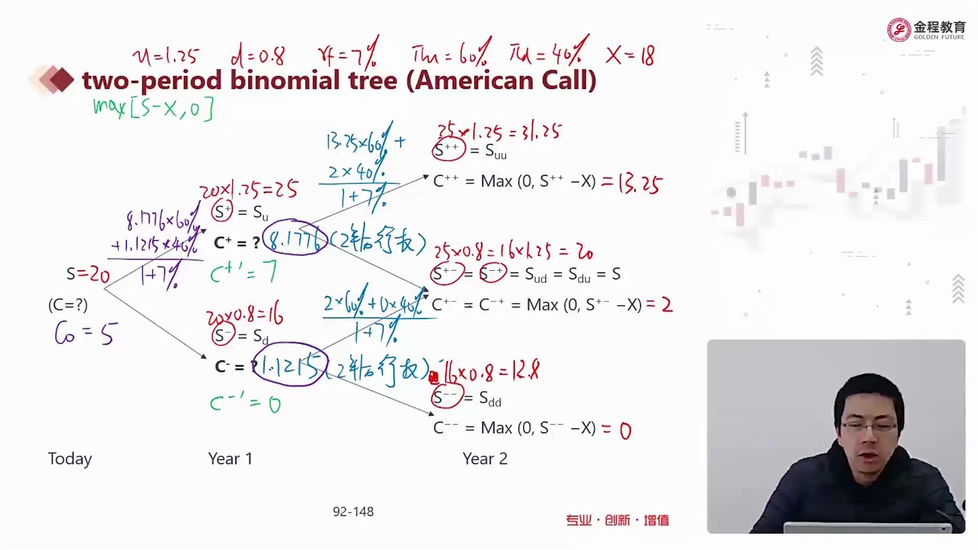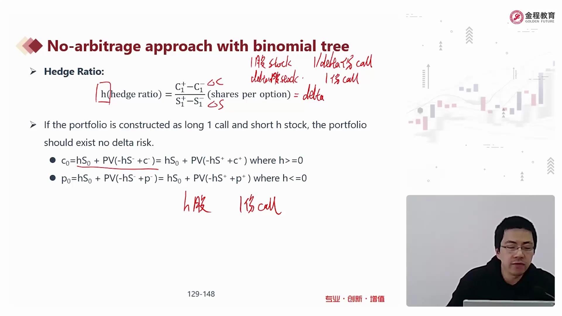 已回答衍生品129页,不太明白这个c的计算公式,嗯,一份期权加上H股股票组建了这个组合,一年以后会有两种可能的价格,一个是C+加上hs+, 另外一种是C-加上h*s-,那么这个组合的现值是等于未来的两种可能的价格乘上各自概率后再计算的现值呢?