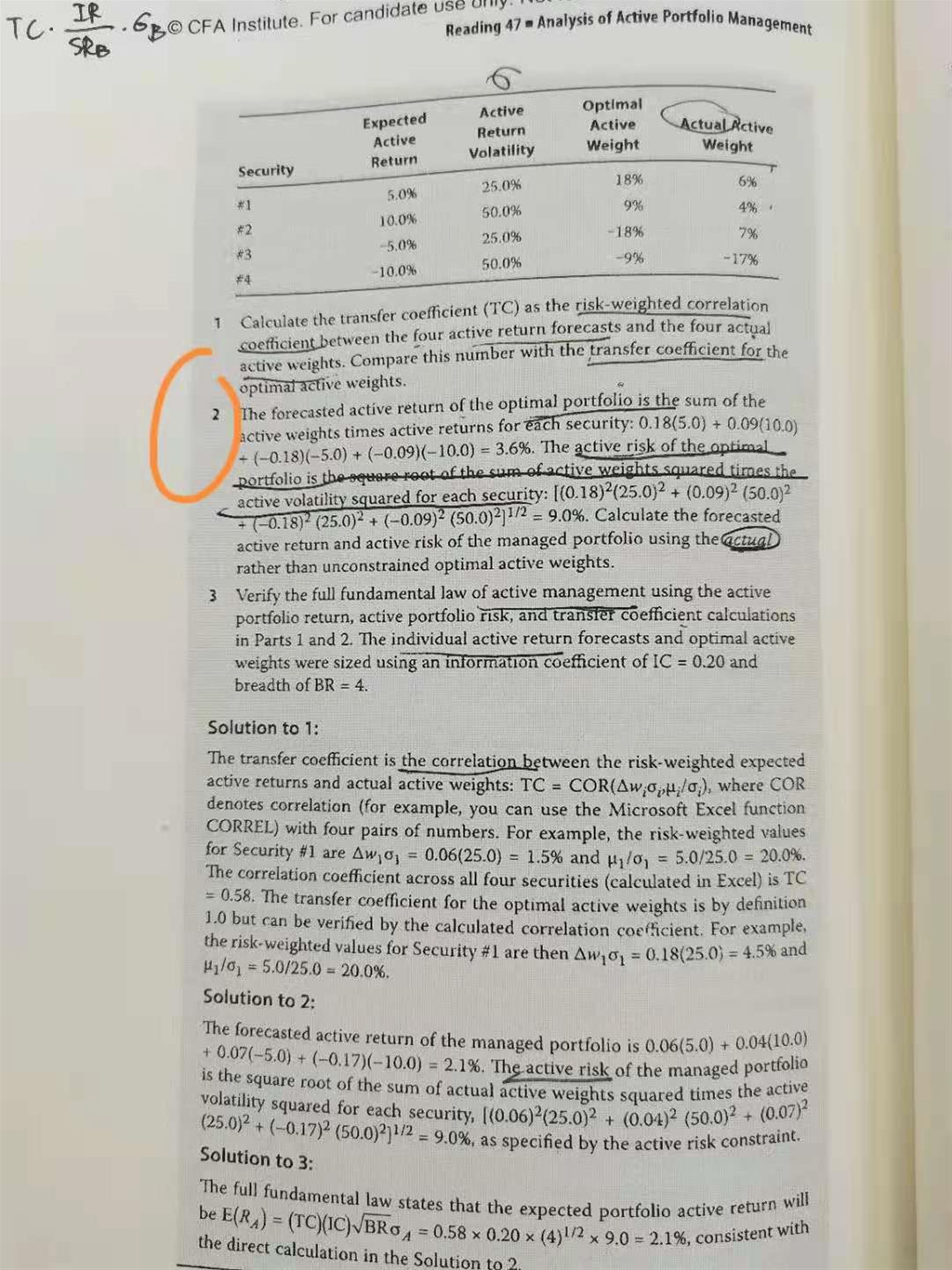 组合书P517例6第2题,请问这个the active risk of the optimal portfolio is the square root of the sum of active weights squared times the active volatility squared for each security,是指的哪个公式?在讲义哪个位置?