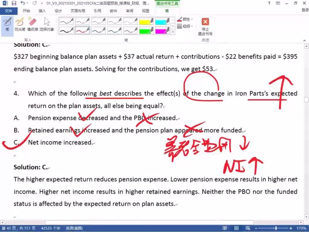 老师 第四题 B和C不是应该都是对的吗?GAAP准则下,amortized actuarial gain or loss = A(R) - E(R), 这里减去了一个比较小的数字,PBO下降,NI上升,而 funded status = plan asset - PBO, PBO下降,所以 funded status 上升,这也没错呀