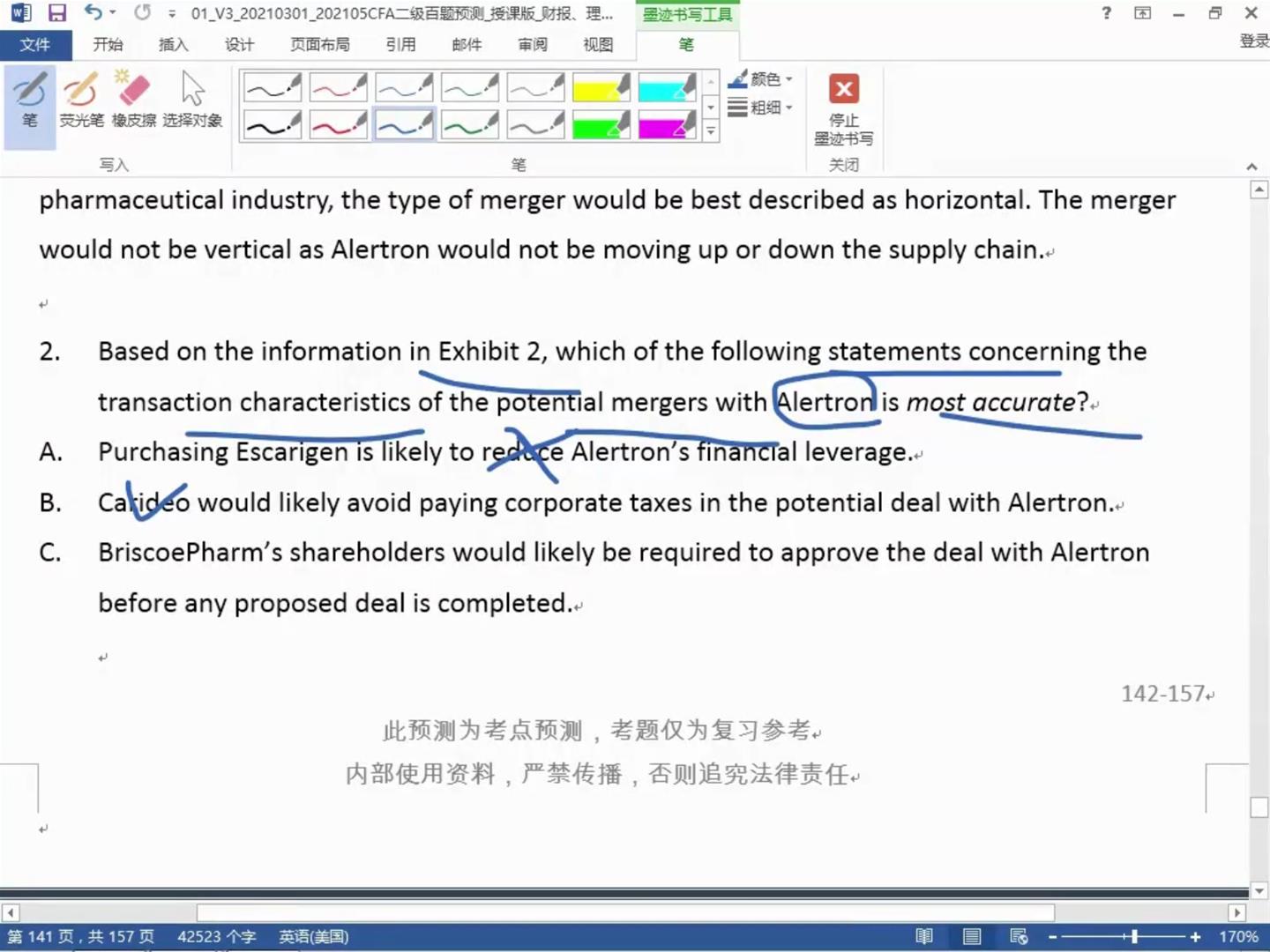 老师,第6个case,能帮忙分析一下第2题的a项吗?这个老师讲不管是借钱还是自己花钱,都会使杠杆率上升?如果借钱的话Debt增加,equity也增加,怎么判断leverage上升还是下降呀?如果是自有资金收购,cash降低,equity增加,不是下降了吗?
