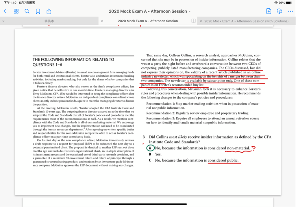 已回答老师好,附件中道德的题目,我不明白为什么该信息是non-material的,不是其中一个公司是潜在并购对象吗?另外为何该信息不是public的,文中说是刊登在行业杂志上的,且只要是订阅用户就能看到,这个不就跟上课时候老师提到的将信息放在付费网站上一个概念嘛,用户自己决定是否花钱看信息就可以了,应该算public info啊。不太明白,盼复,谢谢。