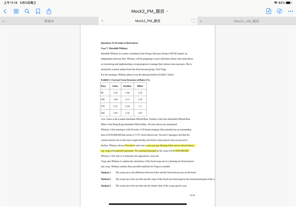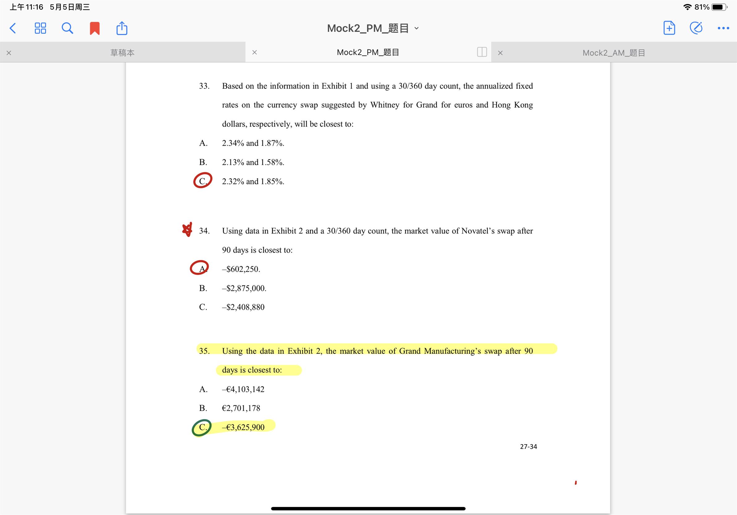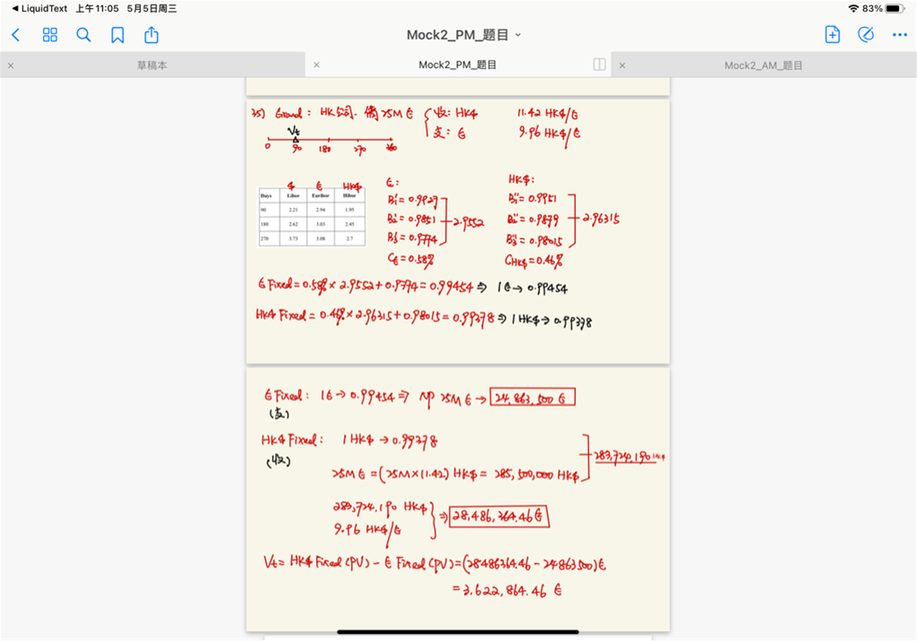 已回答老师好,请教CFA二级,Mock2-PM, 第35题(case7, Meredith Whitney)。是一道currency swap固定换固定的题目,附件是题干和我的计算过程,最后结果算出来和答案差了一个负号,能帮我看一下问题出在哪里吗?谢谢。