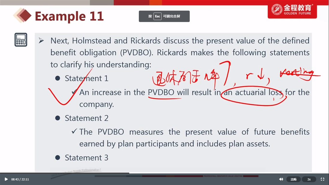 请教下,statement 1,我理解的这句话表达意思是:PVDBO的增加将导致精算损失。为什么老师讲的意思却是:精算假设损失会导致PVDBO 增加?到底该如何理解,感谢