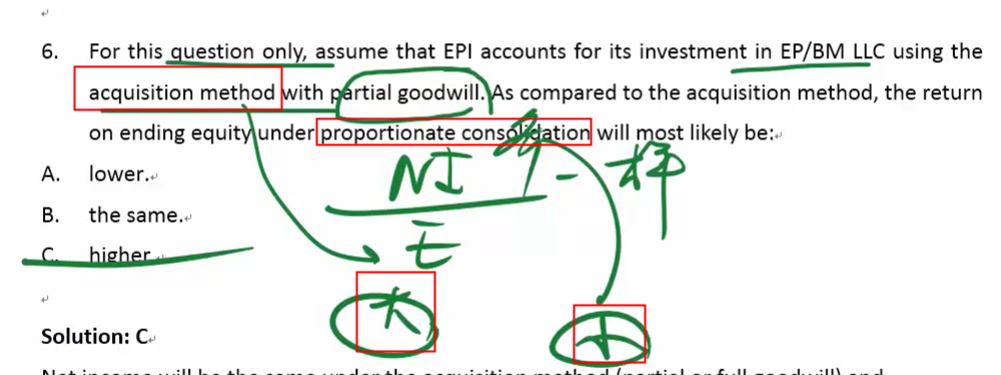 1、为什么合并法的equity是大的,而比例法的equity是小的呢? 2、合并发并入的是少数股东的权益,当持股比例正好是50%时,也就是并入少数股东的那50%,和按比例并入50%不应该正好一样吗? 3、如果持股大于50%,比如90%,那少数股东占10%。那么合并法并入的不就是10%的Equity,反而比按比例合并(90%)的少才对吧?请问这种理解对吗?