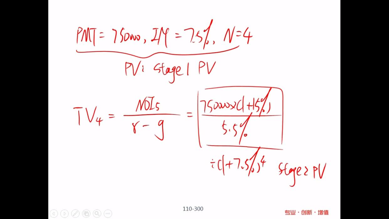 第三题我有疑问 第二阶段四时点现金流折现到零点应该用第二阶段折现率吧? 第二阶段Cap rate5.5% r-g=5.5% g为15% 这里折现率不应该是20.5%吗