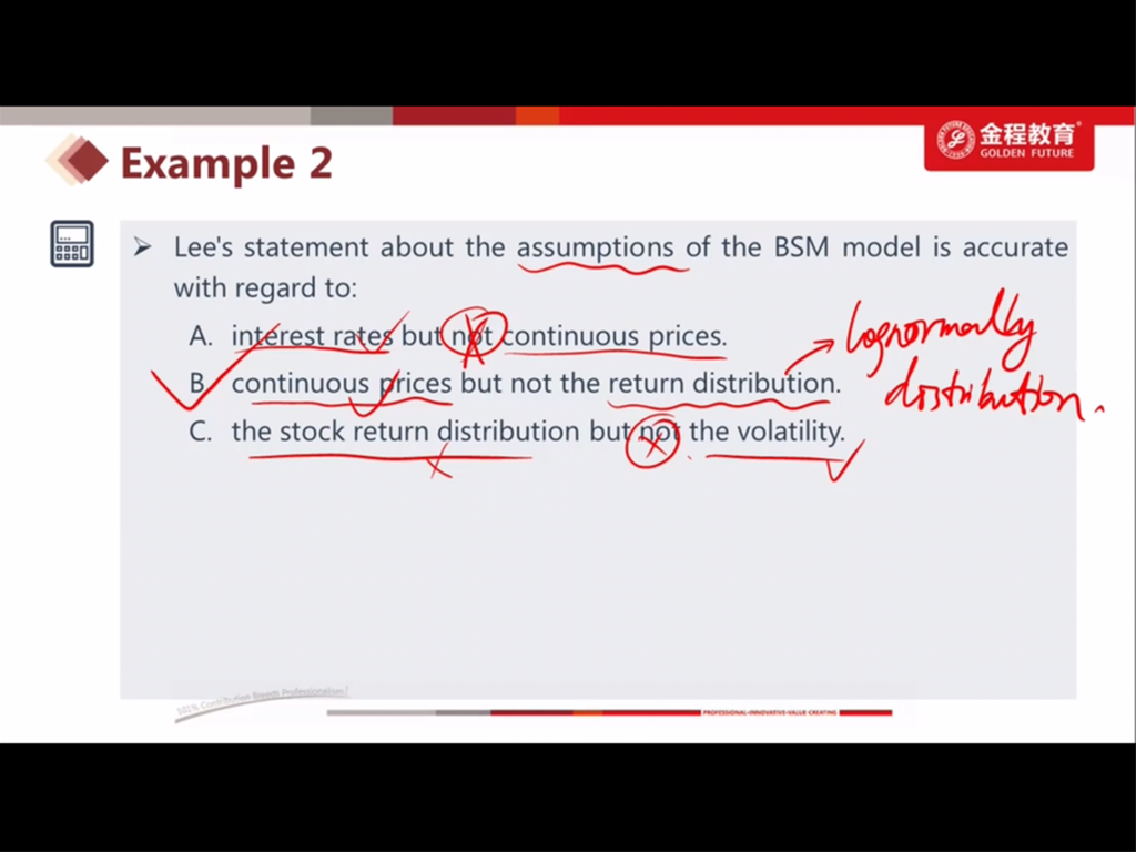 已回答老师 讲义上第一条不是说 price cannot <0, so price has a lognormal distribution, but return could be negative, therefore return is normally distributed. 而这一点一级的时候也是这么说的,但这题B选项为什么要说 return is lognormal distribution 呢