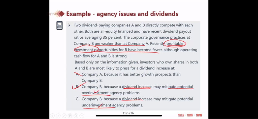 不是很理解 如果B投资机会很少 那应该不是underinvestment才有可能吗? 为什么会有overinvestment的情况 没有投资机会 去寻找也不见得就投资过度?