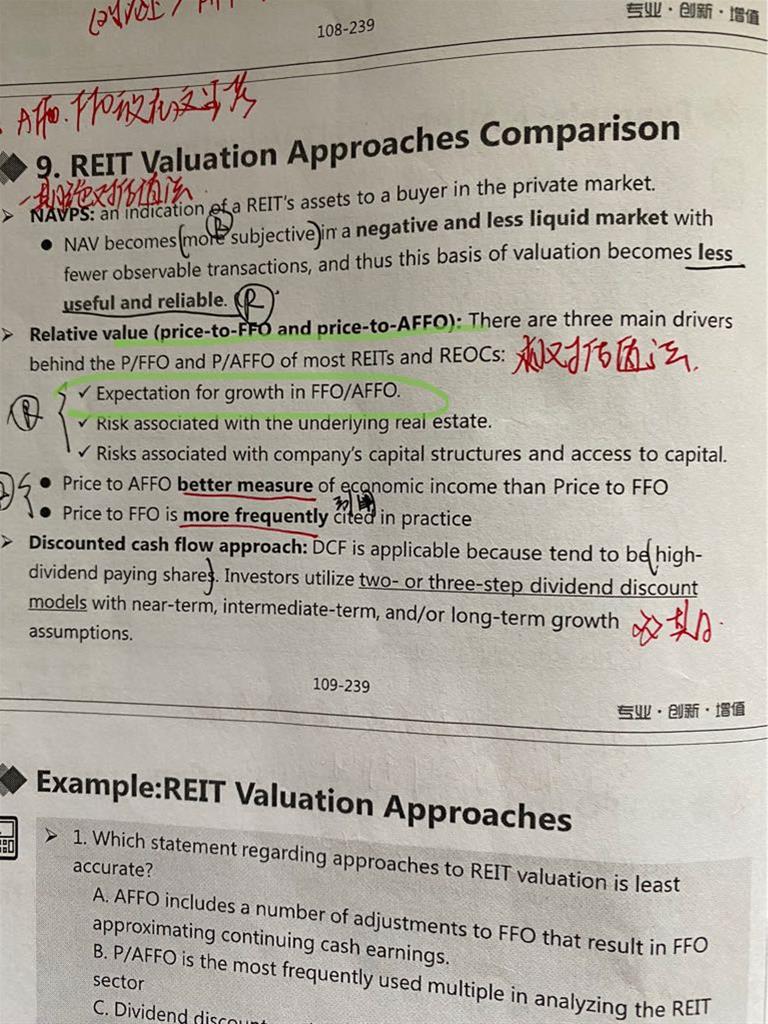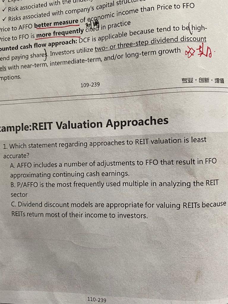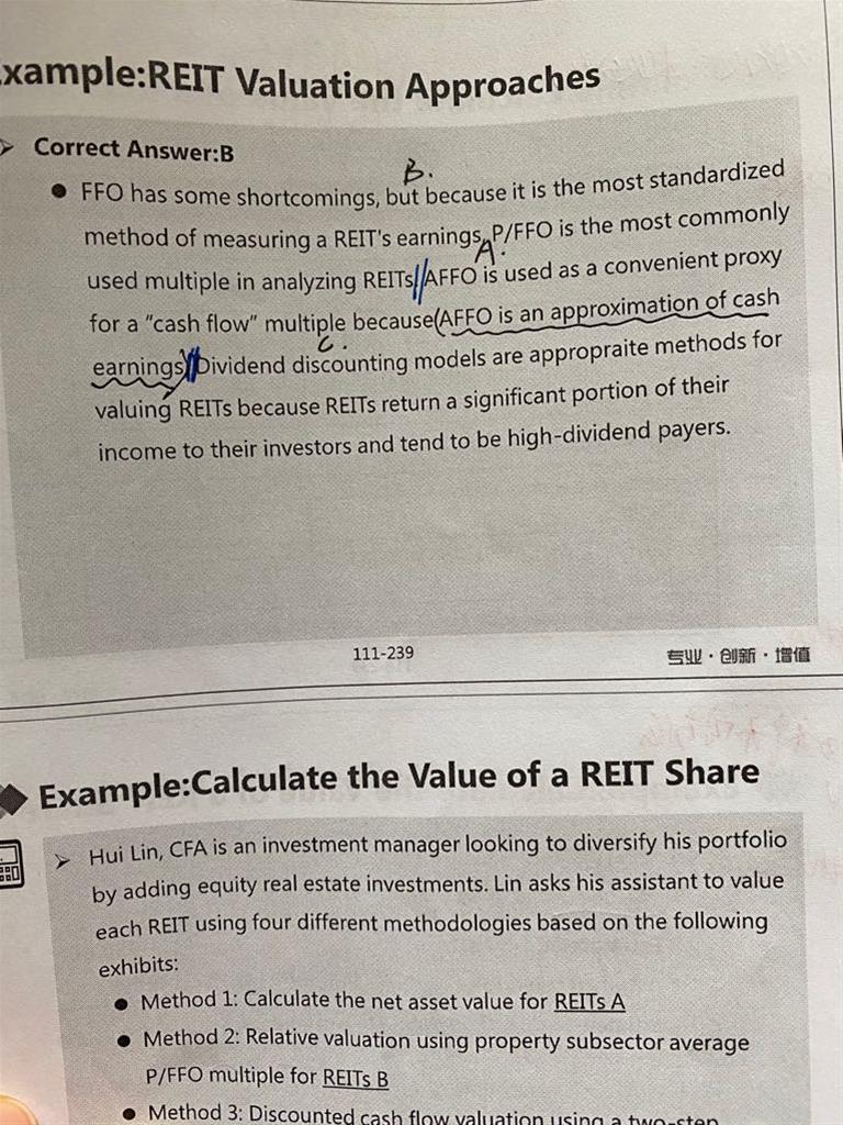 第一张图,P/FFO 和P/AFFO里的P是单价还是资产总价? 第二张图题的答案解释中AFFO is an approximation of cash flow multiple这句话什么意思? A选项什么意思? 您能借这道题再给我解释下一级学习的现金流和自由现金流,以及NOI 和AFFO、FFO的区别?