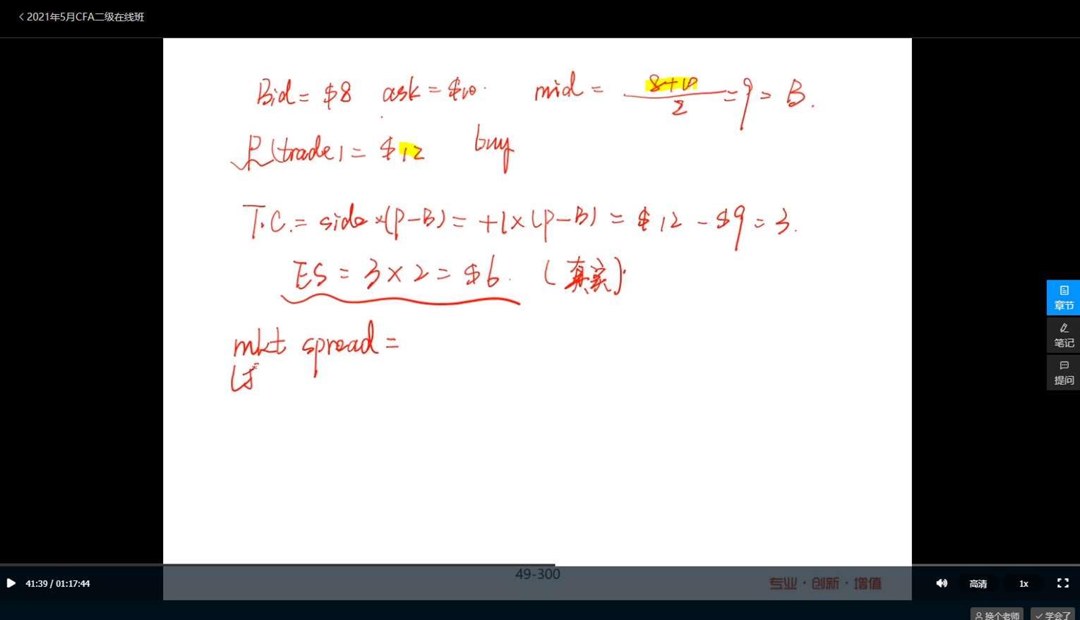 老师好 不是说effective spread 是基于mid quote at the time of the trade 的吗?计算iimpleentation shortfall 的时候才用下单时候的价格去算mide quote的吗? 为什么举的例子是用下单时候的价格来算mid quote的,而不是用交易时候的$12, mid quote =(12+ 10)/2? 谢谢
