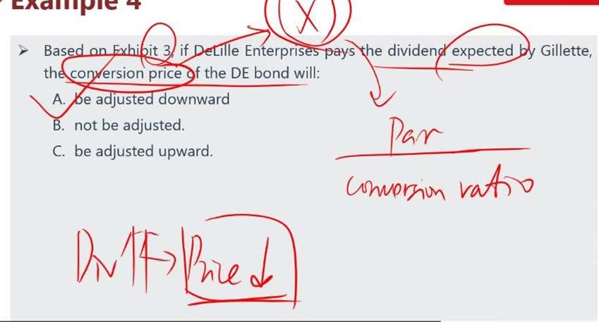 老师 conversion price=issue price/conversion ratio. 其中分子是发行价格, 发行价是发股票之前定好的,股利影响的价格是后来的 为何会影响conversion price呢