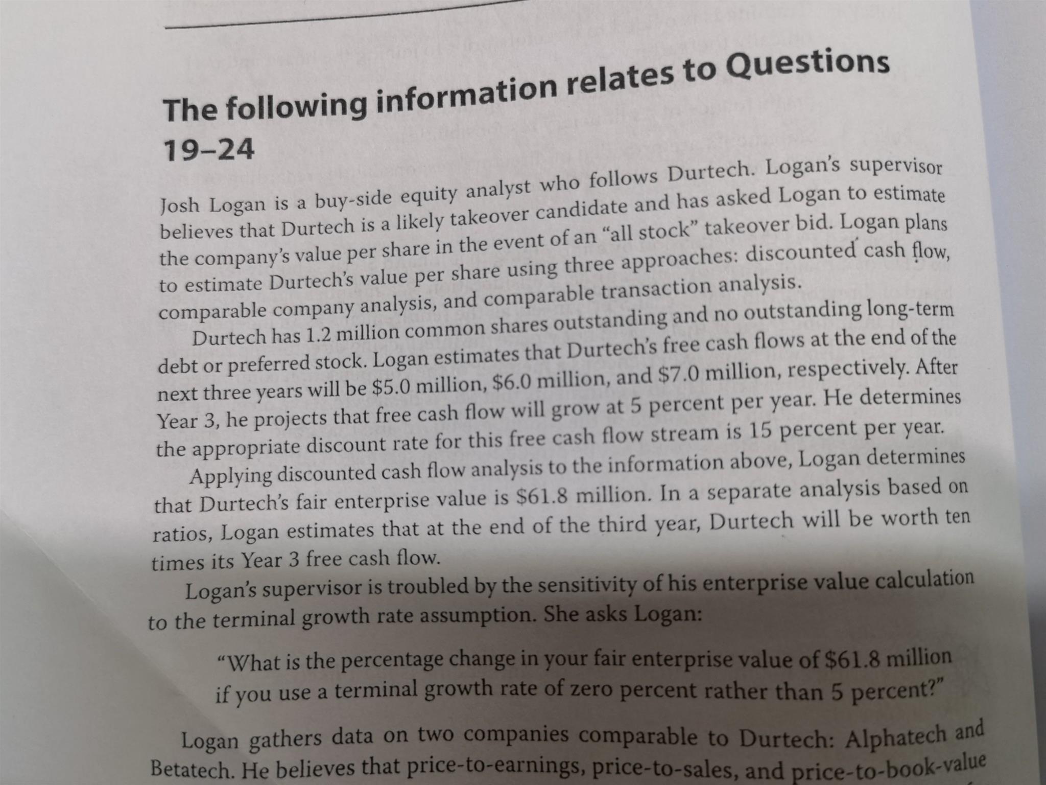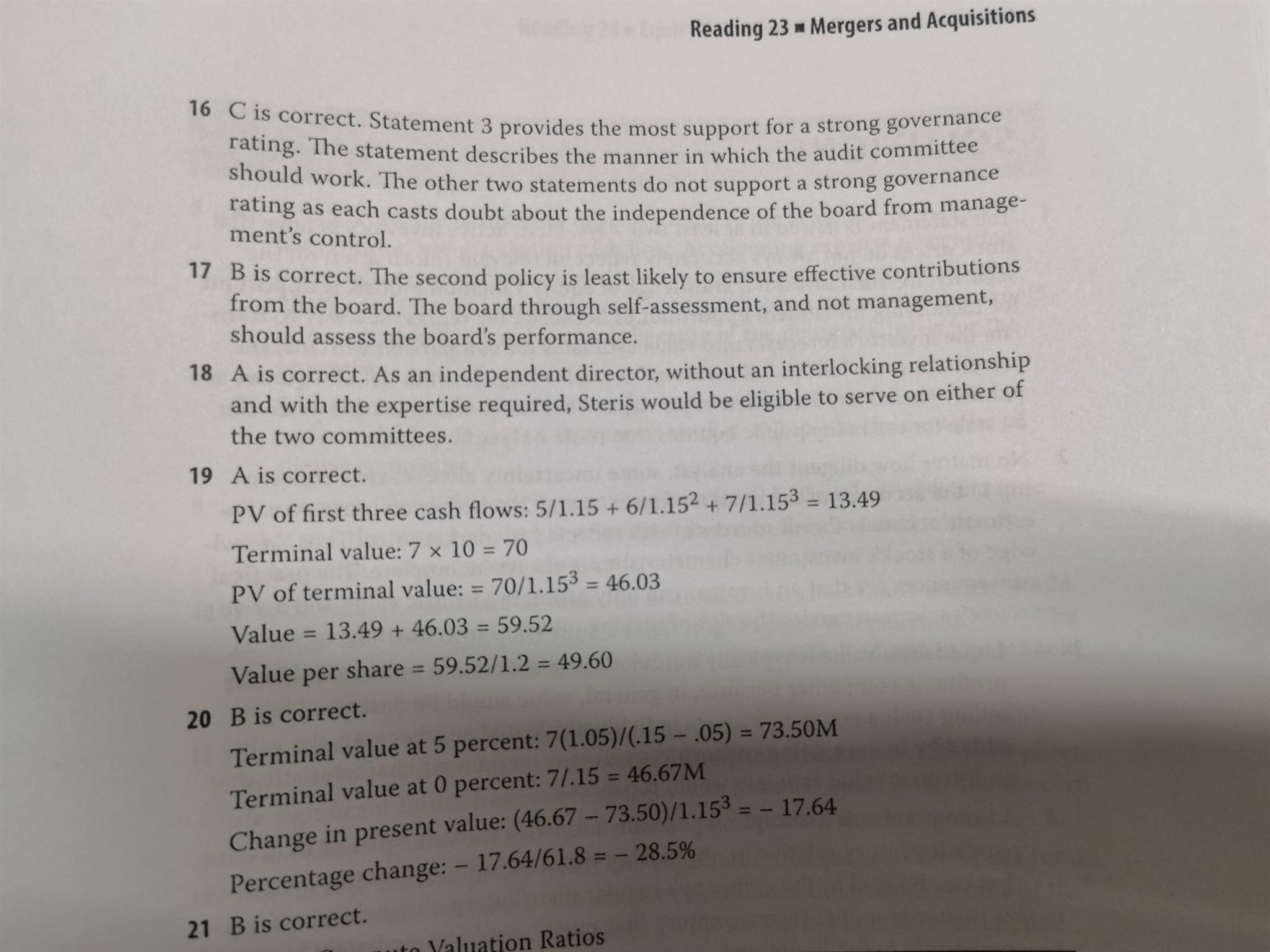 19题这个答案有误,应该是7*1.05*10来折现,而不是7*10。 书本上已经有正确的估值61.8,直接除股票数就应该是B,请确认