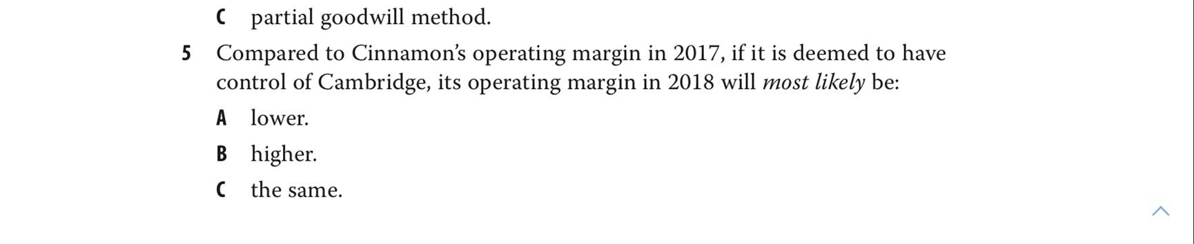 您好,课后题第五题我想问下,这道题的意思不是用2017年cinnamon’s operating margin和18年两个公司合并后的operating margin 对比嘛。我看答案他是同用18年的对比,是我理解意思错了么