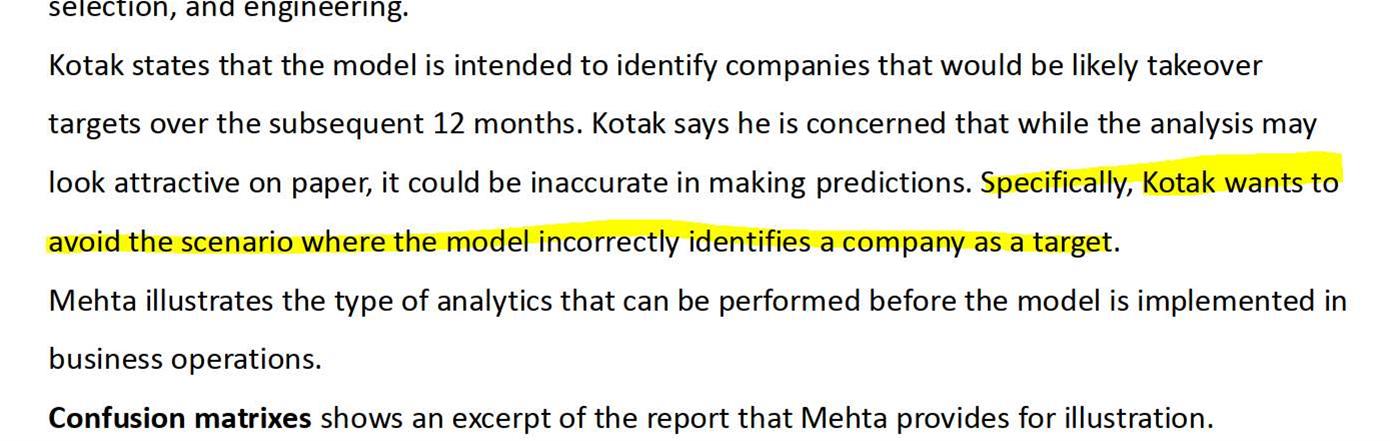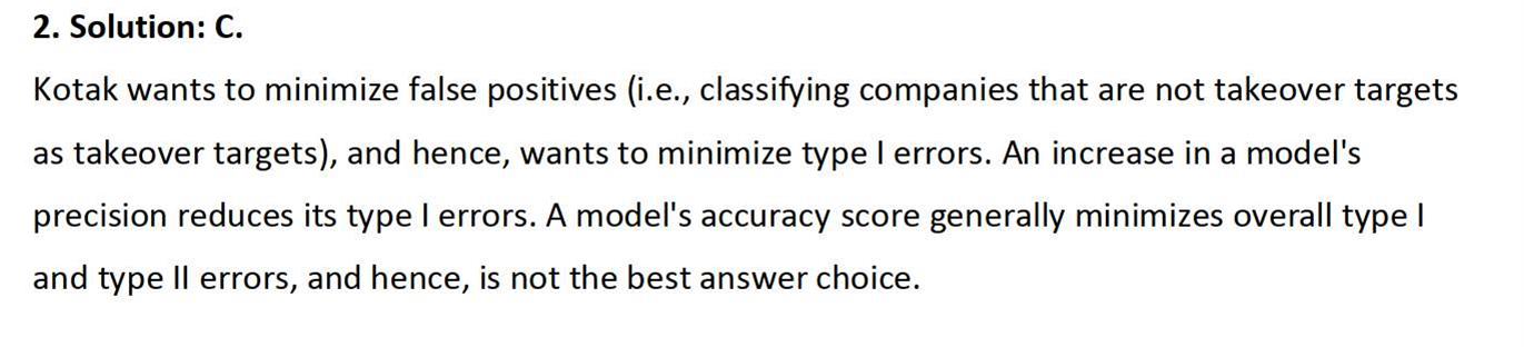 老师好 这是百题quantitative case 7里的第3题,题中说K wants to avoid the model incorrectly identifies as a company as a target. 是说担心把不该是target的公司做为target,是吗?这不是担心取伪吗? 那不应该是type II error, 求recall? 但答案里说是type I error 求 precision. 谢谢。
