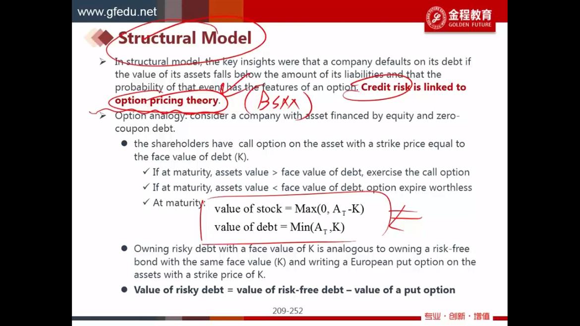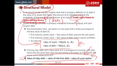 老师,structural model是不是该这样理解: 首先,模型假设公司liability是零息债券,且认为公司违约的本质是资不抵债,所以要研究一下这个公司zero coupon debt的公允价值,看公司Asset的市场价格是不是大于它? 其次,在形式上,payoff of stock=Max(0,A- K),和期权到期的payoff形式是一样的,所以可以把求value of stock看成是求call option on stock,并用BSM的方法(BSM公式中,S0相当于公司Asset的账面价值,X相当于债券面值K?)求出call option value。 最后代入公式:Value of Debt=Mkt Price of Asset - Value of Stock。这个求得的Value of debt就是Default Barrier吧?若Asset市场价格低于它,就会发生违约。 其实讲义中,value of stock=Max(0,A- K), 写成payoff of stock是不是更好理解?