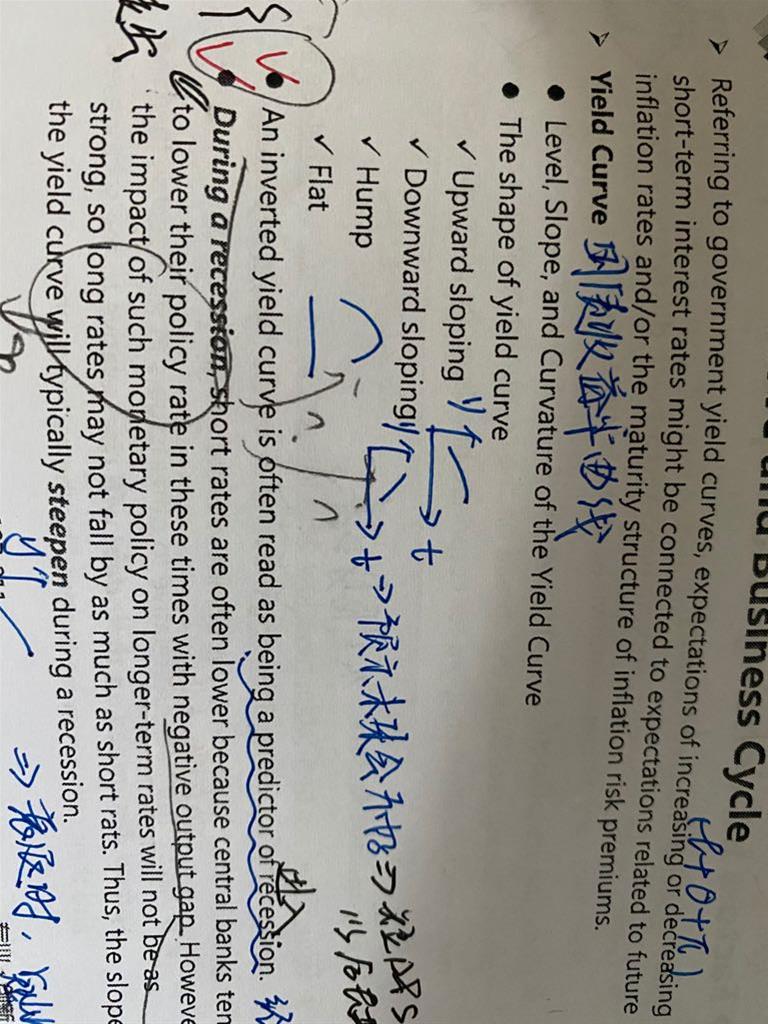 图中 打红钩的第一句话an inverted yield curve ,是指hump 还是 downward sloping 的那个图形? 第二句,during a recession 为什么是steepen 的?