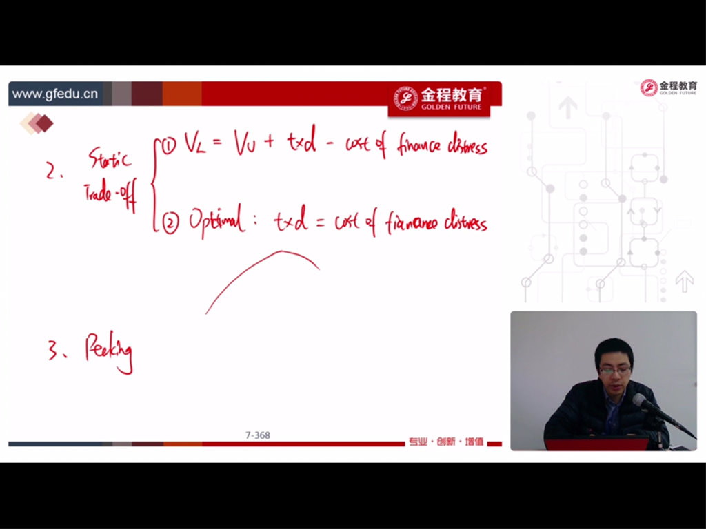 权衡理论中,最优资本结构出现在税盾现值等于财务困境现值,那体现在第一个公式中不就是Vl=Vu?也就是最优资本结构下,有负债企业价值就等于无负债企业价值?