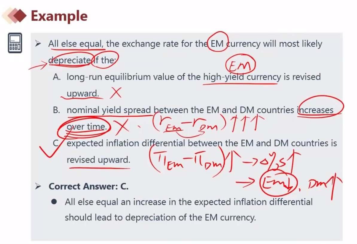 我想问一下,他说C选项是πem-πdm根据之前学的平价理论,国际费雪那不也是等于rem-rdm,那差值越来越大,跟B选项的描述就一样了,Rem就增加那不是升值吗?