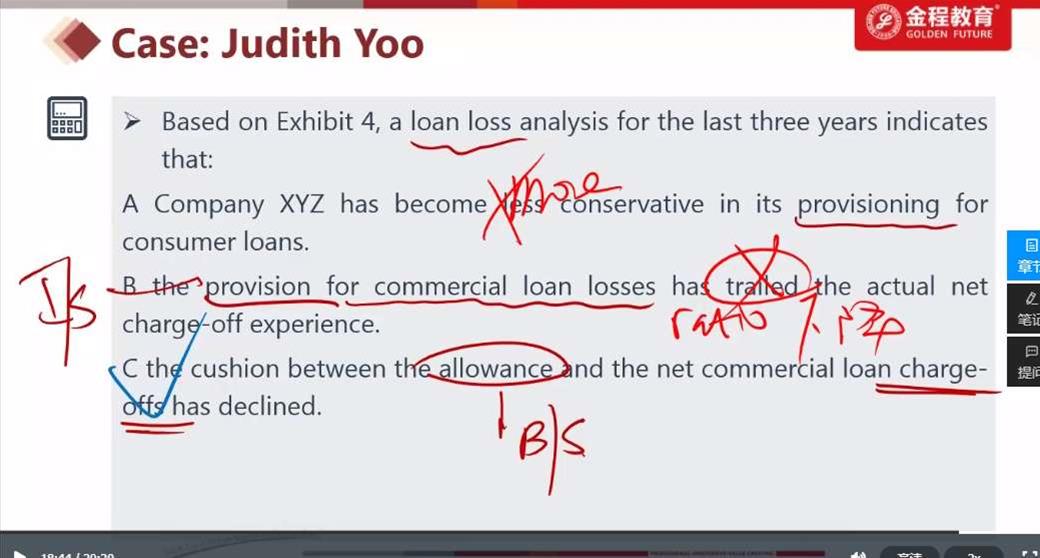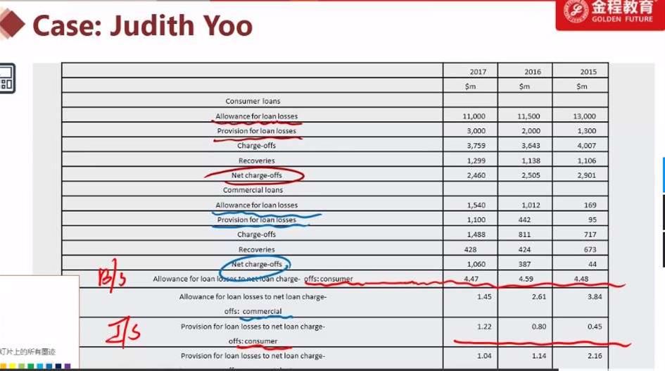 老师 1.这里B. 我们看到数据net charge-off就是下降的,这里provision for commerial loan也是下降的。这句是所谓的trailed了呀,是一致性变化的。(讲解里说的)是上升才是trailed?上升就反倒是non-trailed了才对吧。2.C里面说的cushion是否是2015-2016;2016-2017这三年之间的两个差值?叫cushion? 3. (net)Charge-off 是否是损失的概念?还是什么的意思呢?所以我们算出的四行比值,也就是provision or allowance/net charge-off是越大越好的对吗?