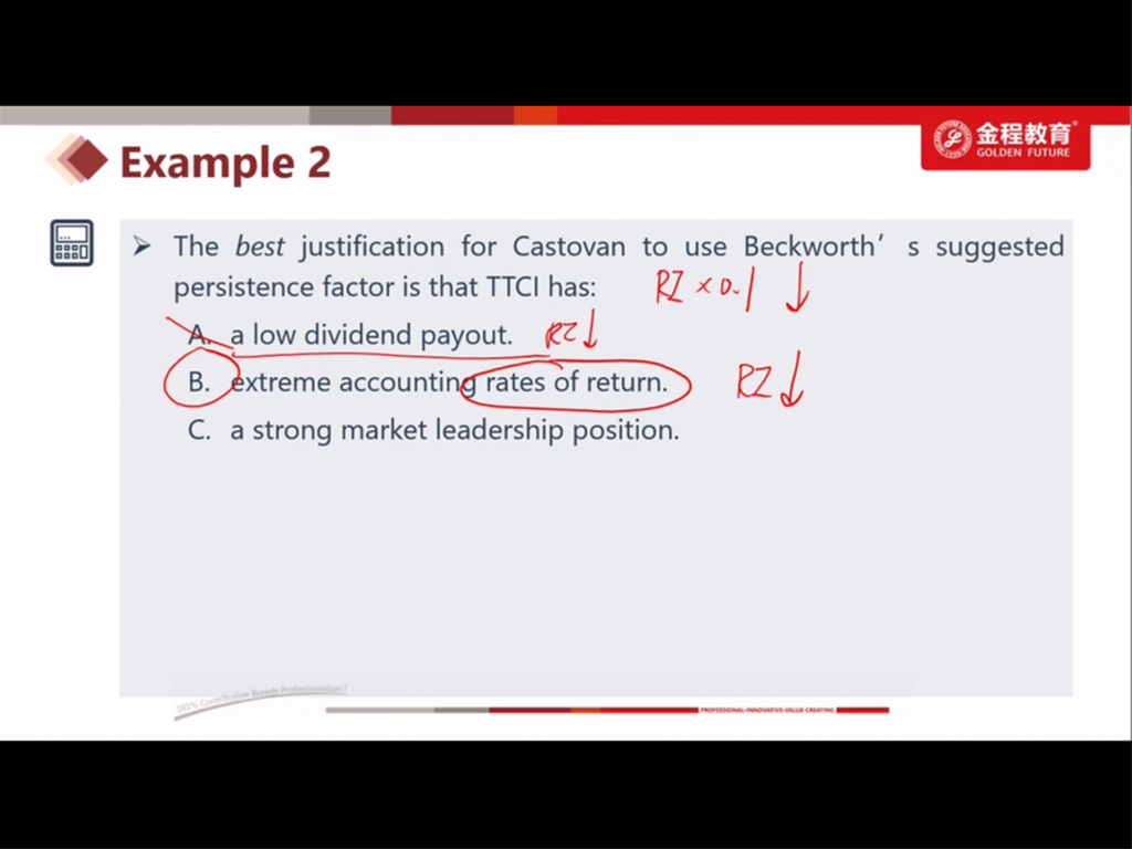 老师 我对这一题的C选项有点 confused. 不是说越大型越成熟的公司 ROE will fade over towards Re, 所以RI decreases 吗?那这题为什么B选项好过C选项呢?