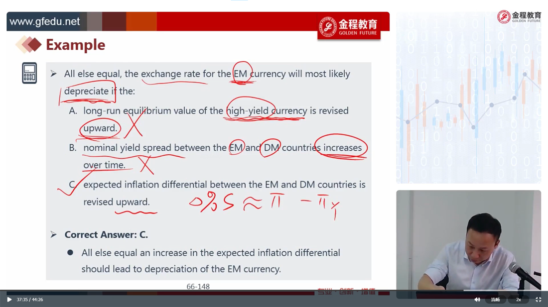 - 老师,第三题答案的意思是:1.因为宽松的货币政策,导致加元利率下跌,导致加元贬值?2.但是,如果利率下跌,也就是分母上的百分比下降,不是会导致价格上升吗?。3.从而短期看是depreciation,但是长期来看,会回归到均值,所以是appreciation?