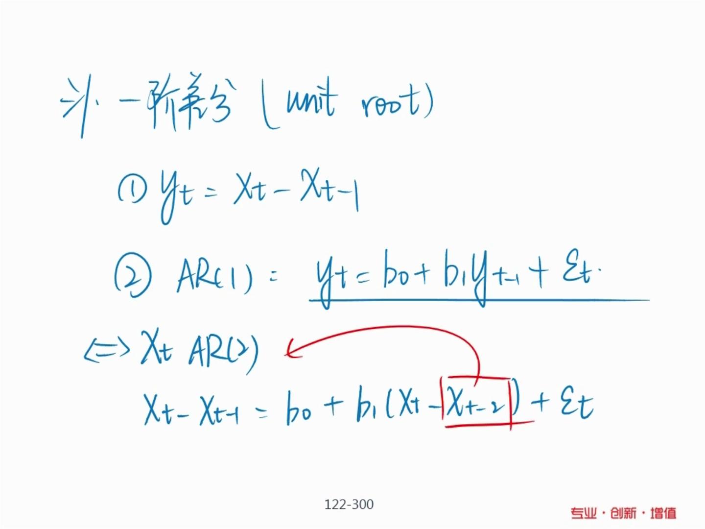你好,这里讲到备择假设g小于0了,但是左边这个因变量不再是X(t)了,而是,相当于Y为X(t)-X(t-1)了,那自变量的变化对应的应变量就不是自序列下一个数了,那这里因变量怎么理解呢?