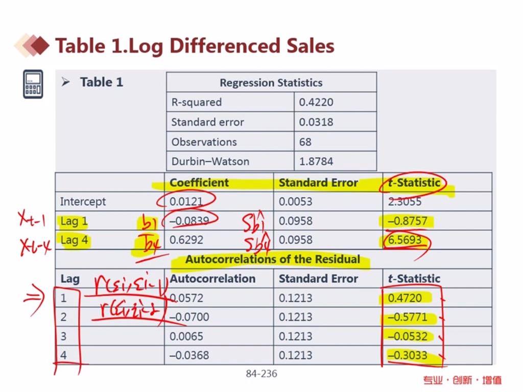 lag4是自变量,第二张表检测是否有相关性,第三张表lag中的1234是什么意思?