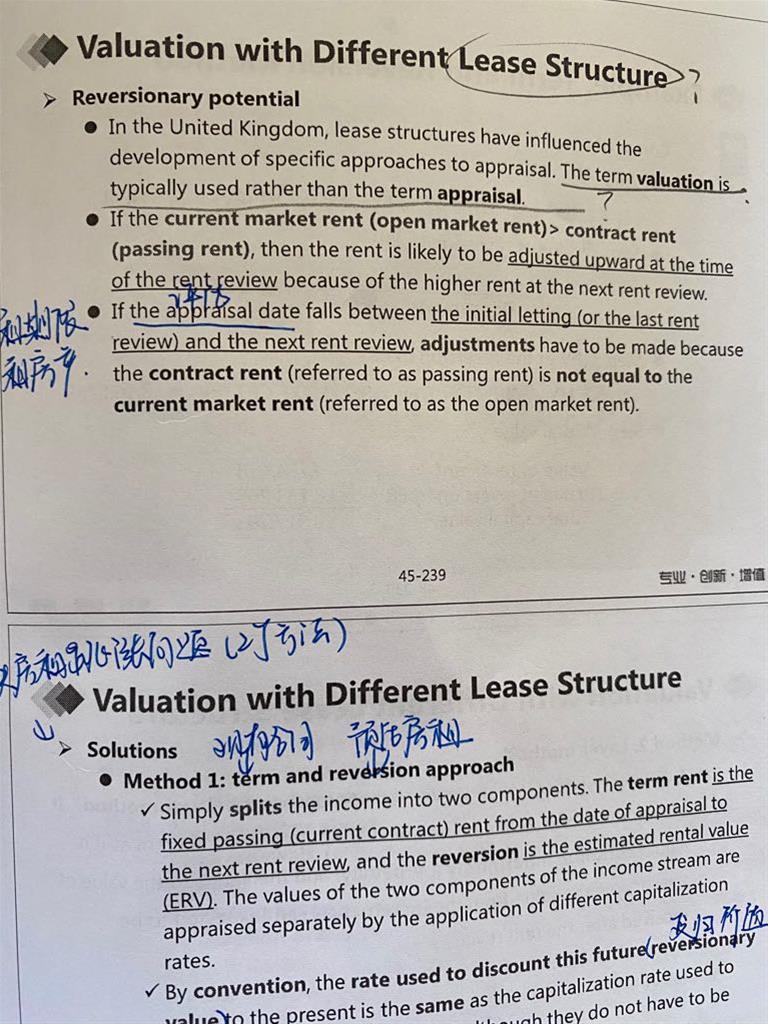我想问图中PPT 45页它这个标题,1. valuation with different lease structure ,这个different lease structure 指什么? 2. 图中画问号的 the term appraisal 中文意思是什么意思?不是专有名词吧?