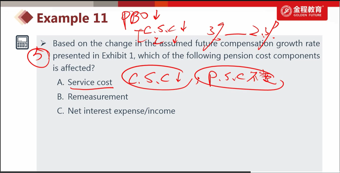 为什么老师在解释A选项的时候说growth rate变大,PBO下降,从而Interest cost也下降? 解释C选项的时候说Interest cost不变,我理解是interest cost = PBO期初*r,期初PBO不变,interest cost也应该不变。 那A选项的interest cost下降是为什么呢?
