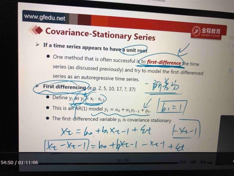 请问老师这个一阶差分,具体是怎么推出来那个yt=a0+a1yt-1+ut这个式子的?我用老师说的方法带进去推不出