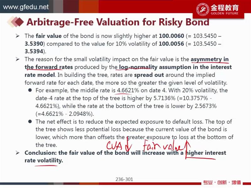 利率波动率增加,导致二叉树更加分散,由于二叉树不是对称变化,因此利率增加的多降低的少,所以CVA降低。 老师,根据上面这套理论,利率波动率增加导致利率朝更大的方向变化,VND也会降低啊,最后VND➖CVA不一定升高还是降低啊