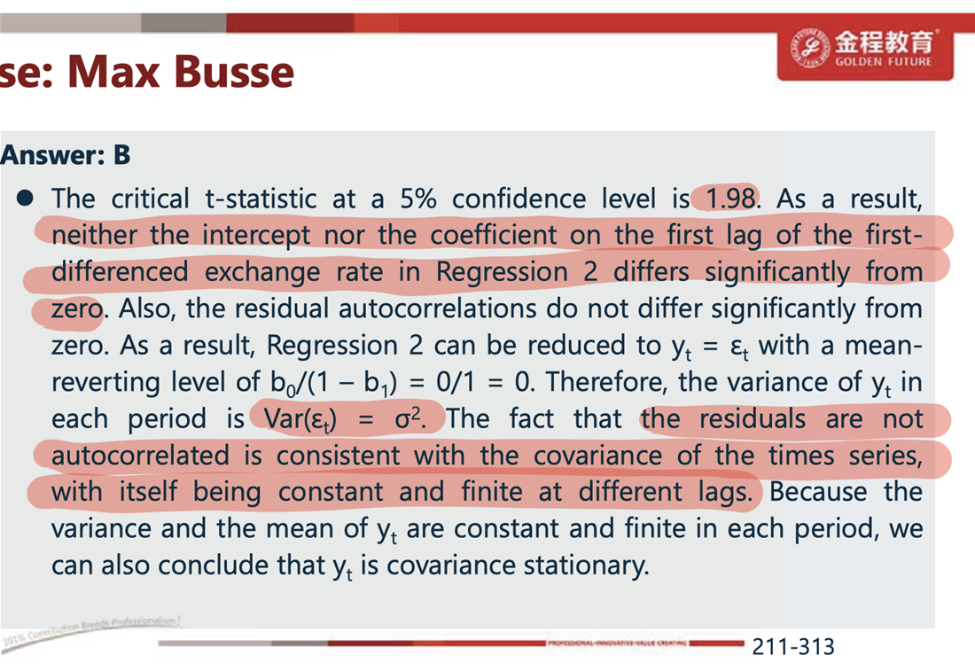 Max Busse的第二问, 如何理解答案? 尤其是Therefore, 后面的部分. Yt的方差等于残差项的方差是因为Yt的变动仅由残差导致么? 这里为什么说residual are not auto correlated? 表1里给的auto correlated的数据全是关于Yt和Yt-i的啊? 还有这里是怎么通过Yt=et就能得出均值, 方差还有协方差为常数且恒定啊?