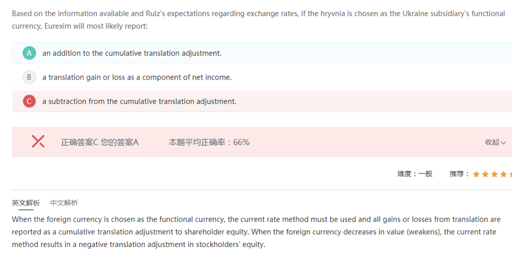 已回答老师 你好,习题6解析里面为什么说外币汇率下降时会调减NI呢?这里面比如拿UAH作为功能币种,UAH贬值下降,采用current method. history rate >current rate:感觉tempo method下的利率会比较小一点,current method 相比较而言不是应该调增吗? 我的思路哪里有问题?