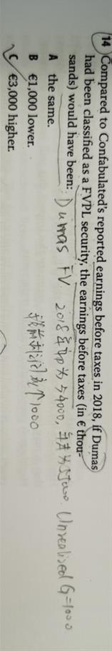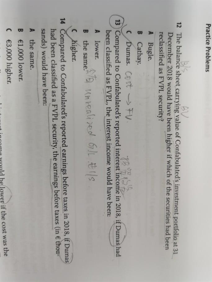 第13题,Dumas从amortized cost 重分类到FVPL,会产生未实现利润,计入利润表,那么投资收益应该会增加呀,答案选B是不是错了,应该选C?