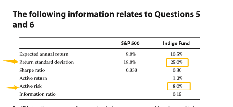 老师好,P541书后题,这里面这个return standard deviation 定义是什么?我理解应该跟active risk 的数值差不多,实际怎么差了那么?25% VS 8%