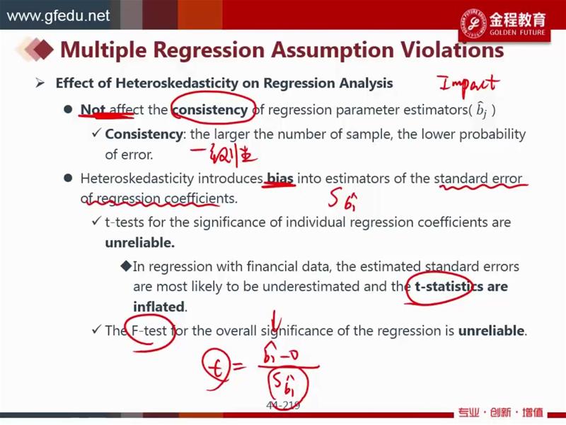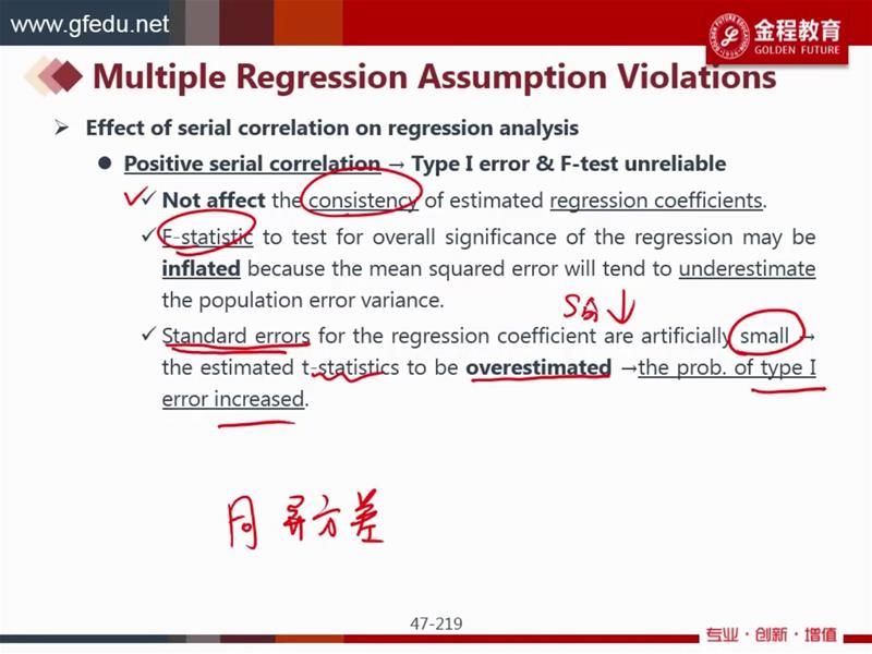 已回答本页讲了:条件异方差影响的是回归系数的标准误。 而前边42页列举的三项中前两项是残差项的事情,第3项奖系数之间的关系。 而实际本页讲的内容与残差项没有关系啊。条件异方差与残差项有个什么关系呢??