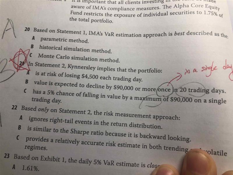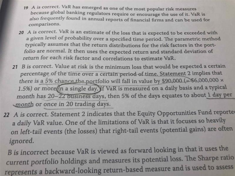 老师好,书后题P392 21题,的B选项为正确答案。为什么他这里的表述要加上in 20 trading days? 我理解就是每日的VaR,即in a single day。术后解析还要解释为one day pe month , once in 20 trading days……直接说in a single day不就可以了吗?
