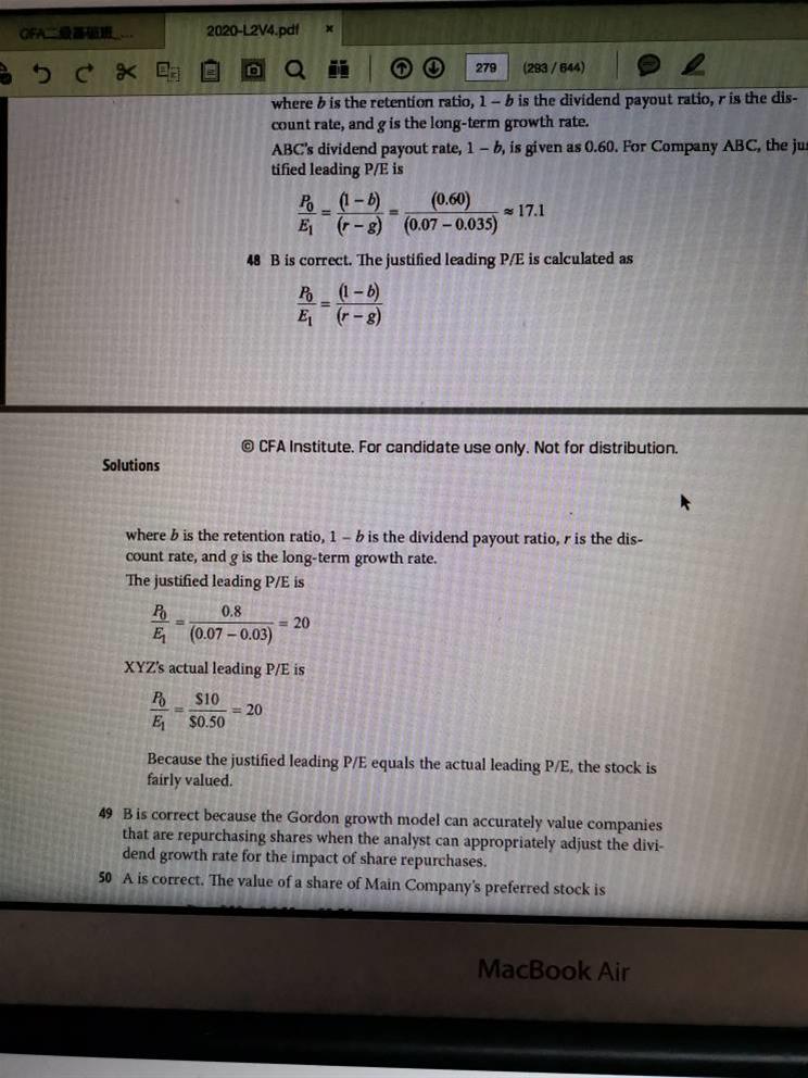 原版书第48题答案中,the justified leading P/E是怎么算的,为什么是用0.8除以0.04啊?