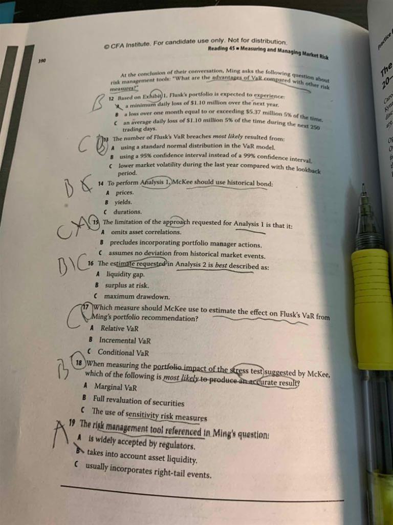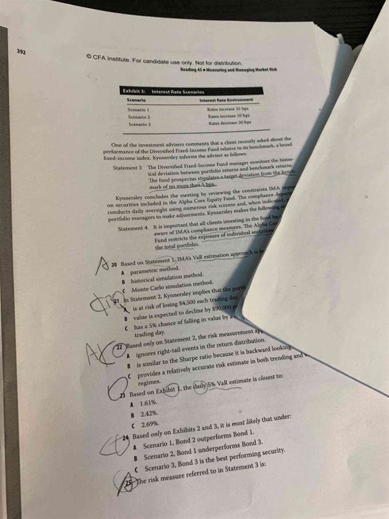 388页 1. 8题 为啥不是stress test? 2. 10题的思路,它哪里写了给的数据是每日不是年化的呢? 3. 11 题为啥是duration,D不是专门针对bond的risk,这个portfolio50%是security啊