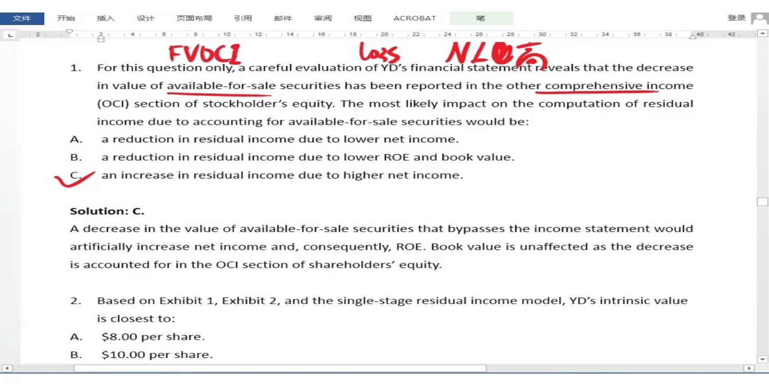 这个case的B选项呢,损失进了资产负债表eqiuty 里面,book value 不是下降了吗, residual imcome 不是等于=B*(ROE-R)吗,对这个公式没影响吗?
