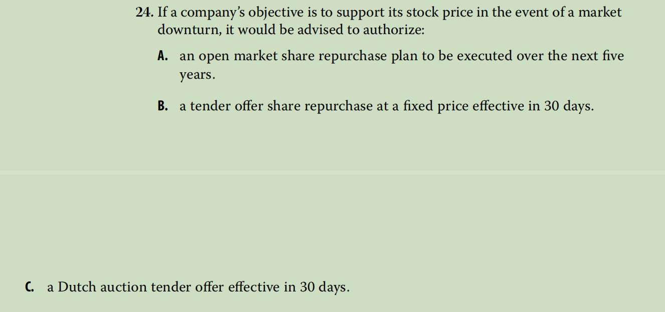 股利回购课后题第24题,如图所示。回购用于支撑股价,A选项用于5年之内,时间太长了,下跌都是短期的,为何选A而不选B呢??B项的要约回购,其实效果最显著了,我看了A股好多,比如2016年那几年上海家化,股价30多吧, 要约回购价40还是50元,结果股价就在50那里支撑了一两个月,因为有套利机会存在,答案解析说BC不是open market,不影响市价,无法理解,怎么是非公开交易呢??想了解一下详情
