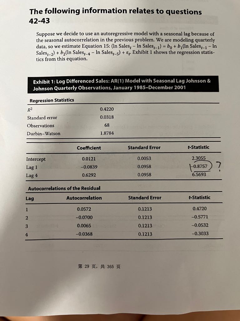 42题,lag1的系数-0.8757,这个系数比较小检验结果是不显著,那lag1的系数岂不是等于0?这么看的话,模型还能说准确嘛?答案是说没有自相关的问题模型就是准确的