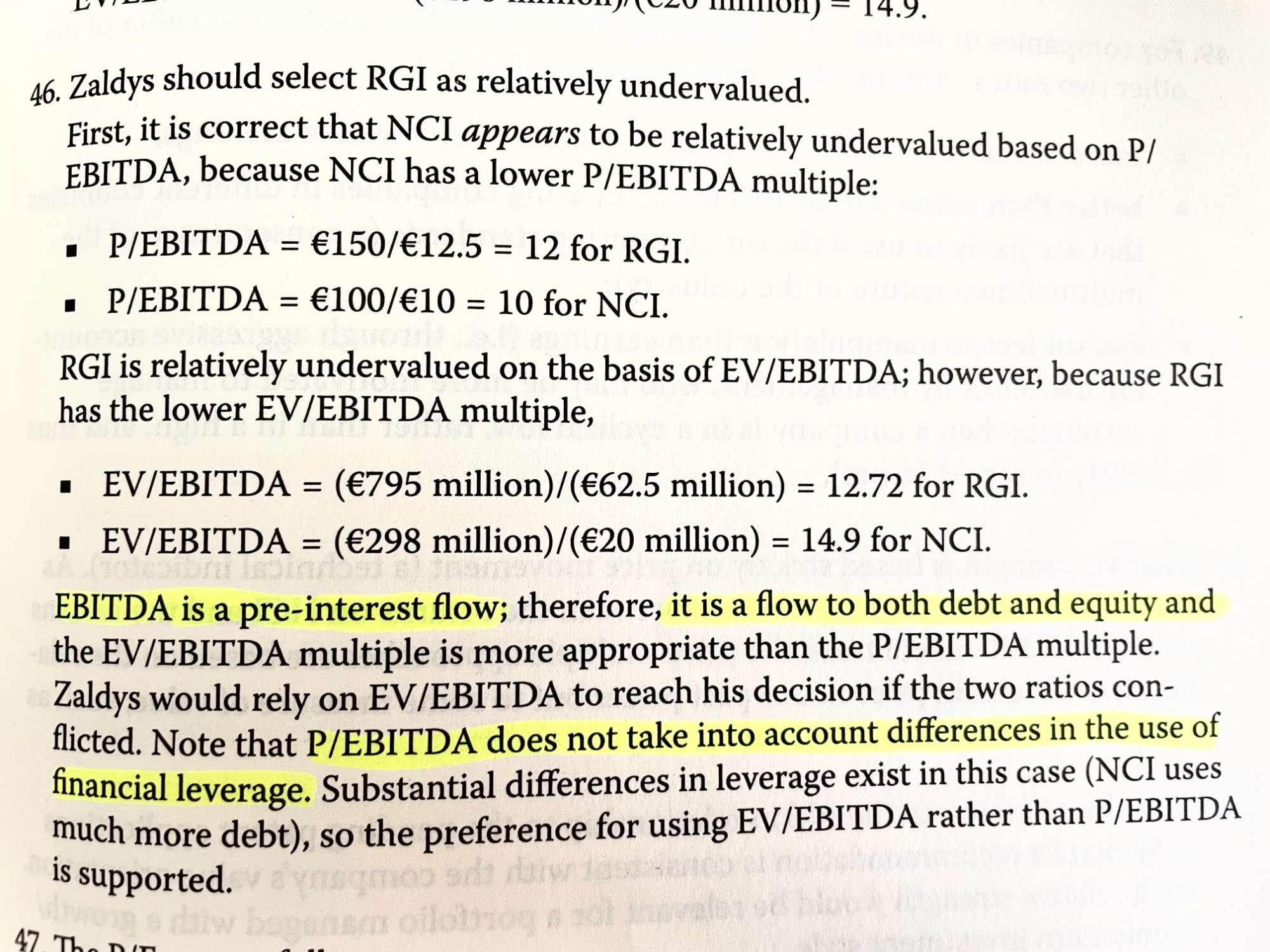 老师,这题解答里不明白为什么EV/EBITDA比P/EBITDA更能准确反映二个公司的估值对比?教材的答案是说因为EBITDA是针对股东和债权人的现金流指标,P/EBITDA没有考虑使用杠杆的比率(debt ratio), 但是EV/EBITDA同样是包含股东和债权人整体的指标呀?