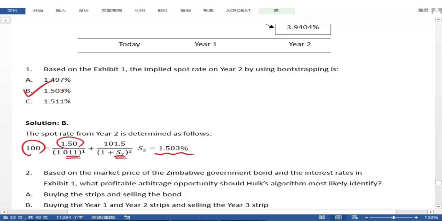 第一问不可以用CR=3.2%的3年国债求implied spot rate2 么? 已知p0=103.5和S1, S3可以求出S2