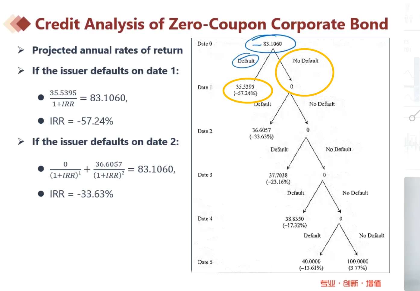 假设不考虑是否零息还是付息债。关于我画黄色圈的部分,一般来说,求预期:假如发生违约,则还可以恢复40%的exposure;那么没有违约,那就没有损失,则应该是100%exposure都在。为什么在 no default那栏只是0 coupon. 不应该是(100%exposure+0 coupon) 吗