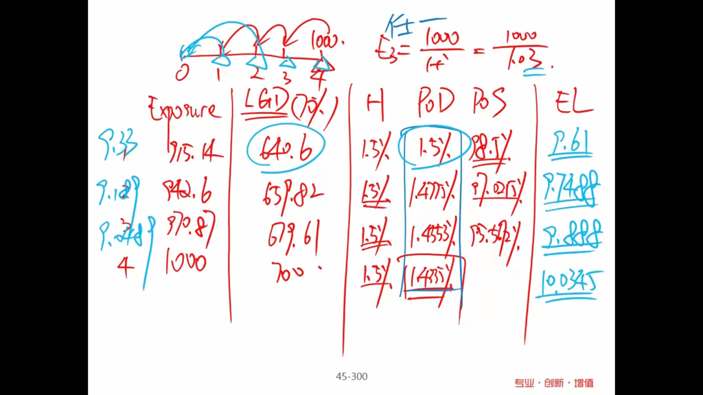 老师,我突然有个疑问,四个时点的违约损失并非同时发生也并非都会发生,比如说1时点违约了,那么债券不就结束了,2时点就不存在违约的情况了,那么把每个时点损失的金额折现到0时点相加是不是不科学呢?