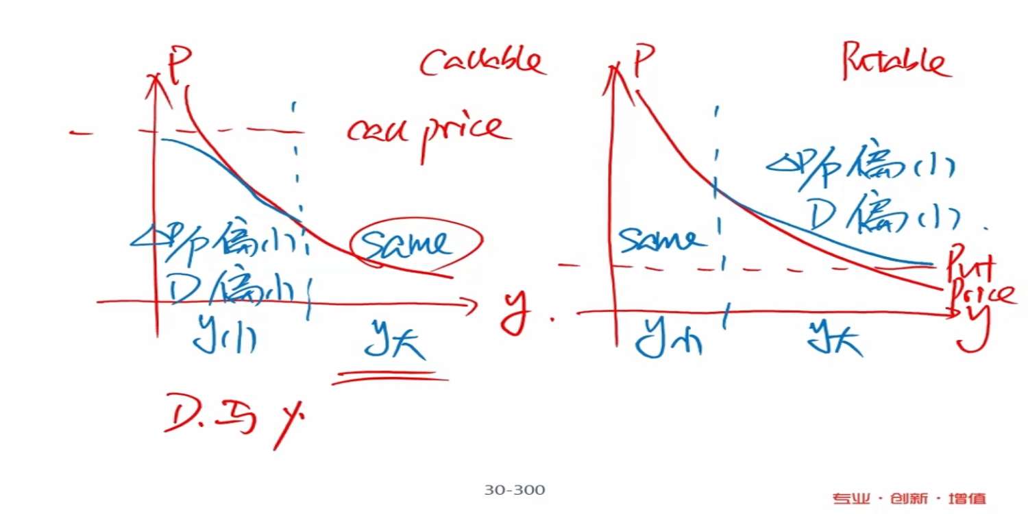 第3小问中,有两地不明白1\ 为什么 duration 与 yeild 是反向?根据 callable 的图,当y越小时,duration 也偏小。从概念上理解,当市场收益(利率)越高,callable bond issuer 越不可能 行权,久期应该是上升呀?
