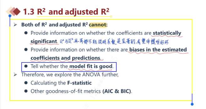 老师,请问一下 R2 和 adjusted R2 都是用来测试模型的拟合是否好的,但是为什么讲义上又说 "Both of R2 and adjusted R2 cannot tell whether the model fit is good"? 请看图蓝色方框那部分