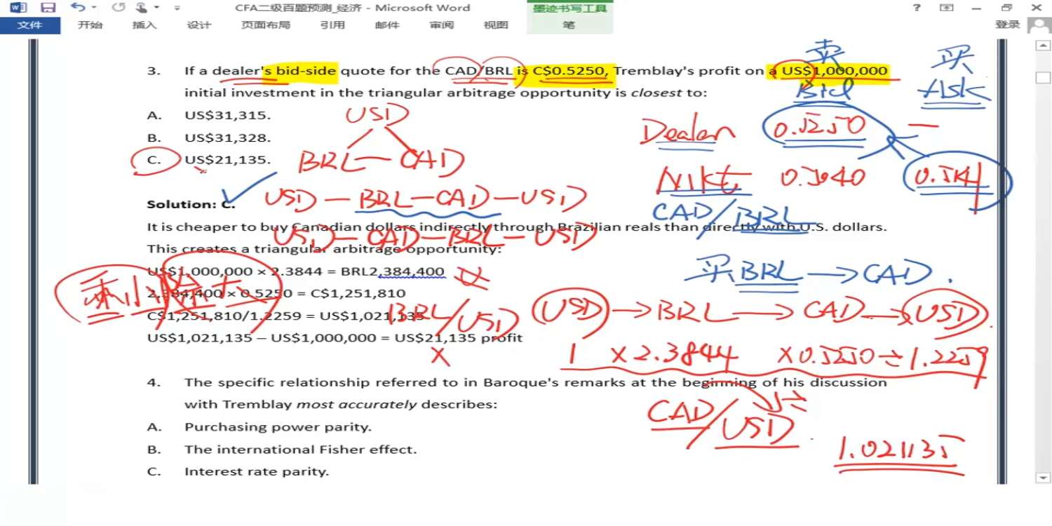 Q3,我的思路有些问题,但又不明白问题在哪。就是算出来可以三角套利,可以用0.5141买入,再用0.5250卖给dealer。那为什么不用0.5250-0.5141算一个差价,再乘以原始资金,再换回美元计算盈利状况呢……我这个思路的错误点在哪?