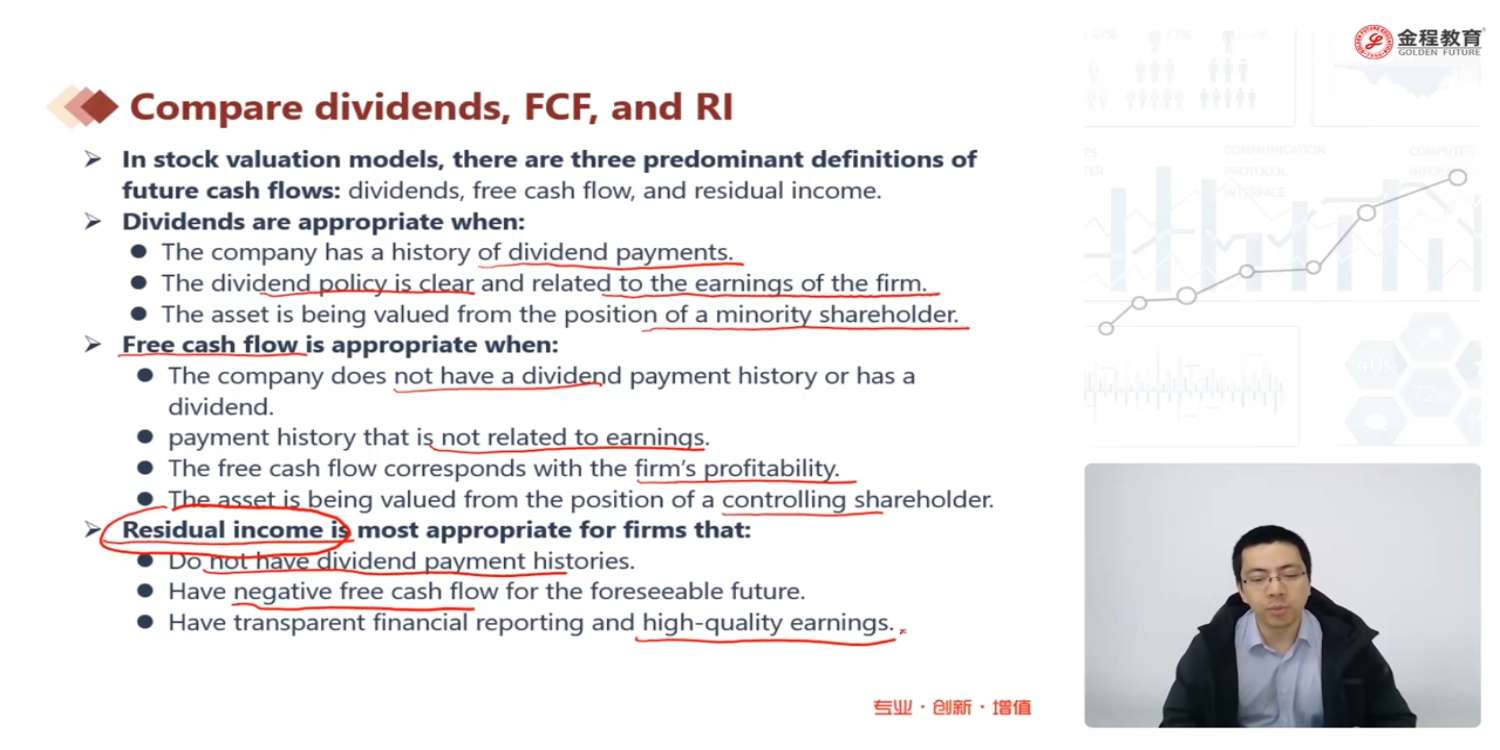请问老师,老师讲到用剩余收益折现模型,最大的好处是对于RI没有什么要求,RI的正负不影响模型使用,但后面讲到,该模型的使用前提是公司账面净利润的数据质量要很高,其中一个条件便是要能cover投资者的资金成本~那此时的RI便为正数。请问老师,是不是相当于使用该模型的前提就是RI还是需要为正的呢?还有想请问老师,有没有RI为负,还能用该模型的情况呢?